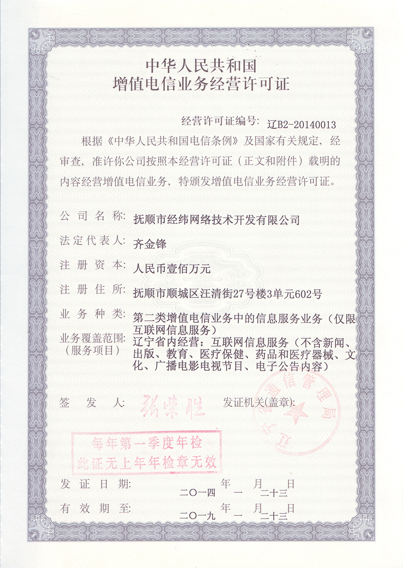 根據(jù)《中華人民共和國(guó)電信條例》及國(guó)家有關(guān)規(guī)定,經(jīng)審查,準(zhǔn)許撫順市經(jīng)緯網(wǎng)絡(luò)技術(shù)開(kāi)發(fā)有限公司按照本經(jīng)營(yíng)許可證(正文和附件)載明的內(nèi)容經(jīng)營(yíng)增值電信業(yè)務(wù),特頒發(fā)增值電信業(yè)務(wù)經(jīng)營(yíng)許可證。