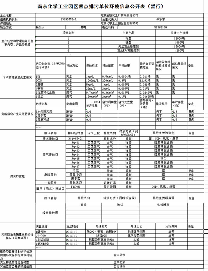 南京化學工業(yè)園區(qū)重點排污單位環(huán)境信息公開表(暫行)